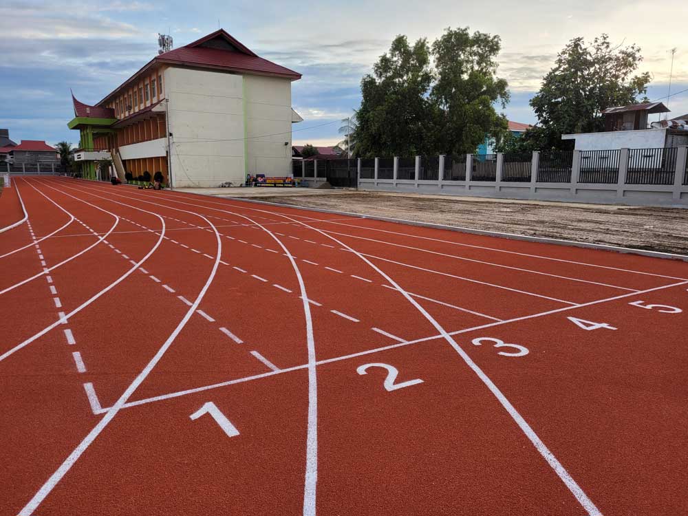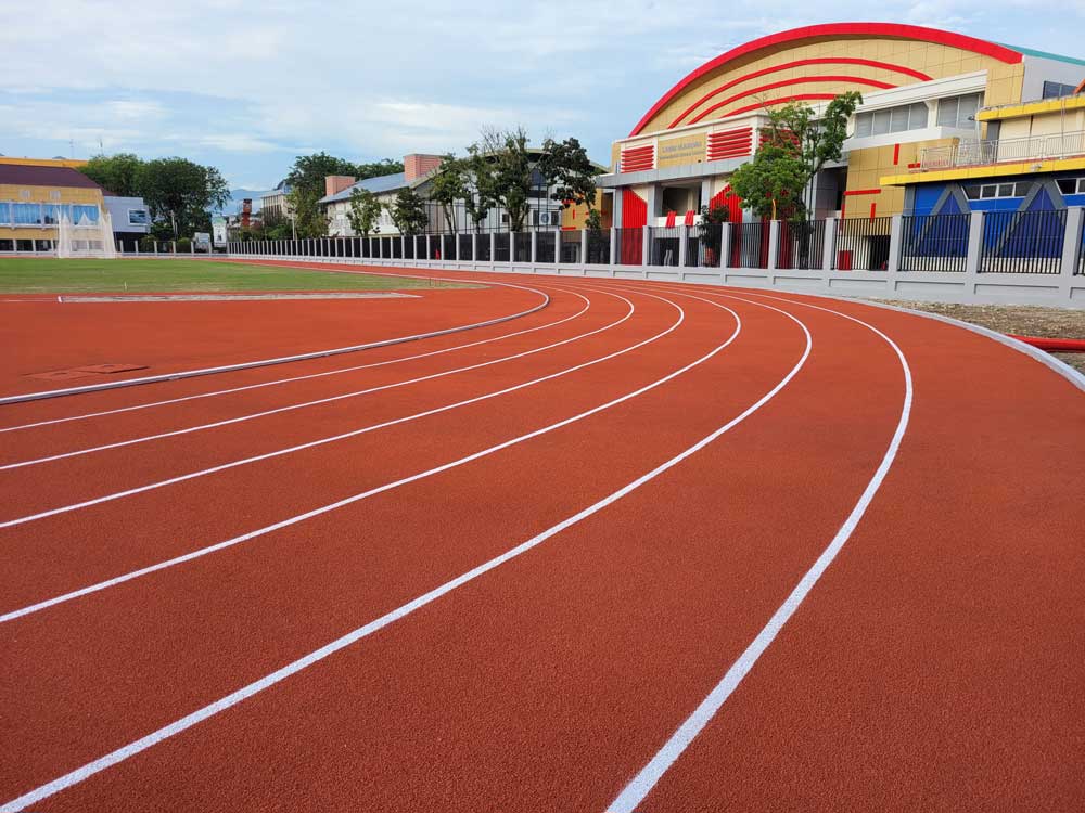 Lapangan atletik ini di-coating menggunakan Tennokote Running Track. Tennokote adalah cat lapangan olahraga, satu-satunya produk Indonesia yang telah bersertifikat International (ITF level 4), dapat diaplikasikan pada eksterior maupun interior dan memiliki daya lekat baik pada lantai beton, aspal maupun pada paving. Sesudah kering Tennokote akan membentuk lapisan film yang fleksibel dan memiliki daya lekat yang kuat pada lapangan yang terbuat dari beton dan aspal. Pengecatan dengan Tennokote Running Track ini dilakukan guna menghasilkan lapisan fleksibel untuk keamanan dan kenyamanan penggunanya.